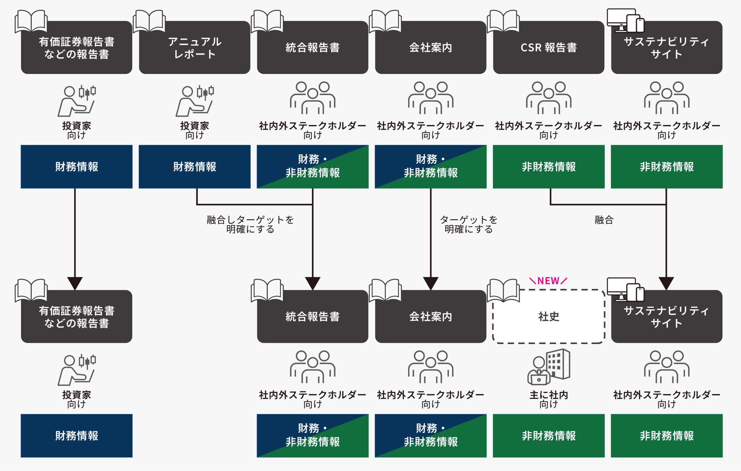 自社が本当に伝えたいメッセージは?誰に届けたいのか?その軸を明確にすることが、ツール戦略の再設計においては欠かせません。関連する既存ツールが複数ある場合、例えば下図のように投資家向けであるアニュアルレポートを統合報告書にまとめ、目的が同じCSR報告書とサステナビリティサイトをサステナビリティレポートのサイトとして融合することなどで、情報の重複を減らし訴求力を高めることができます。