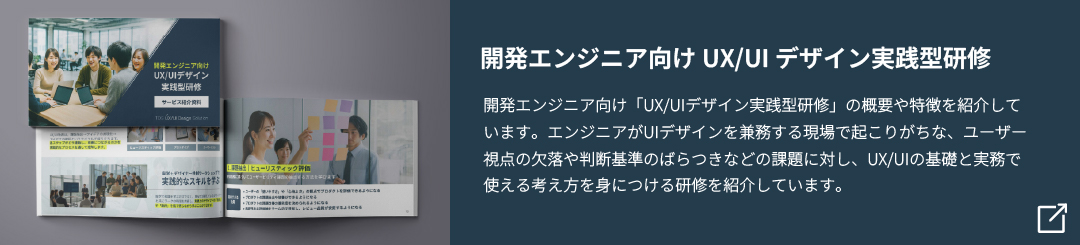 こうした課題感に基づき、エンジニアが実務の中で活かせるUX/UIデザインの基礎を身につけていただくために、私たちテイ・デイ・エスでは「UX/UIデザイン実践型研修」を提供しています。