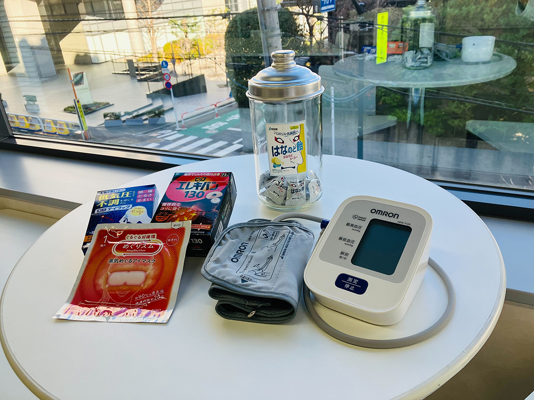 また勤務中の気になる症状について、社内アンケートを実施して、特に症状の多かった、「頭痛」「目の疲れ」「腰痛」「肩こり」に効く、使い捨てのケア用品をオフィスに設置して、気軽にリフレッシュできる環境を整えています。