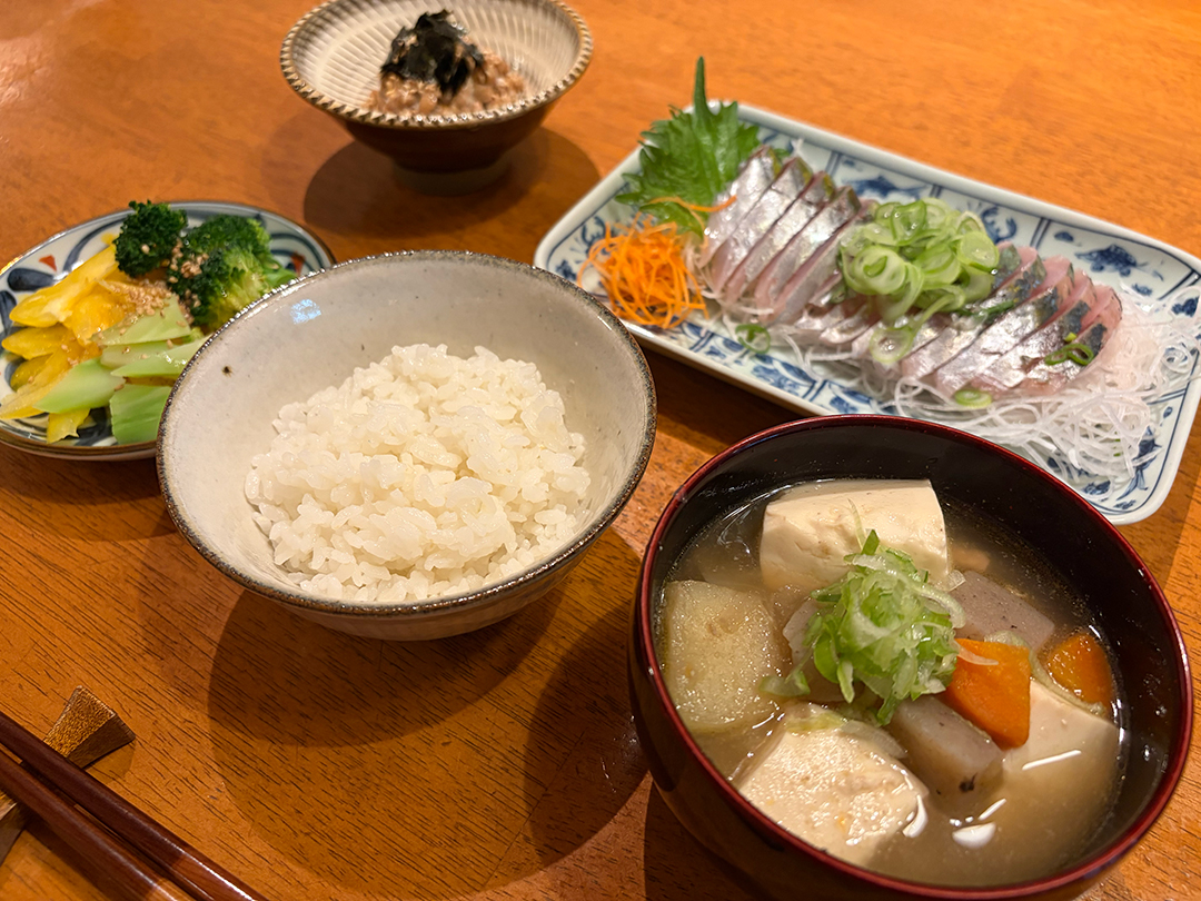 家で、食事をする際は、「主食・主菜・副菜」を揃えるようにして、副菜は2品以上になるように努力しています。またメニューの種類だけでなく、栄養素にも目を向けて、多様な食材(肉・魚・野菜・豆・乳製品など)をバランス良く摂取できるよう気をつけています。