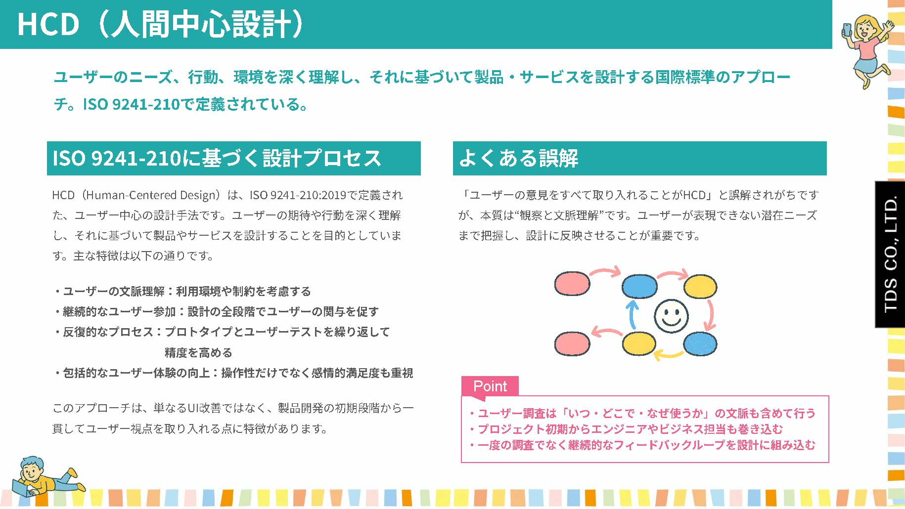 HCD(Human-Centered Design)は、ISO 9241-210:2019で定義された、ユーザー中心の設計手法です。ユーザーの期待や行動を深く理解し、それに基づいて製品やサービスを設計することを目的としています。主な特徴は以下の通りです。
