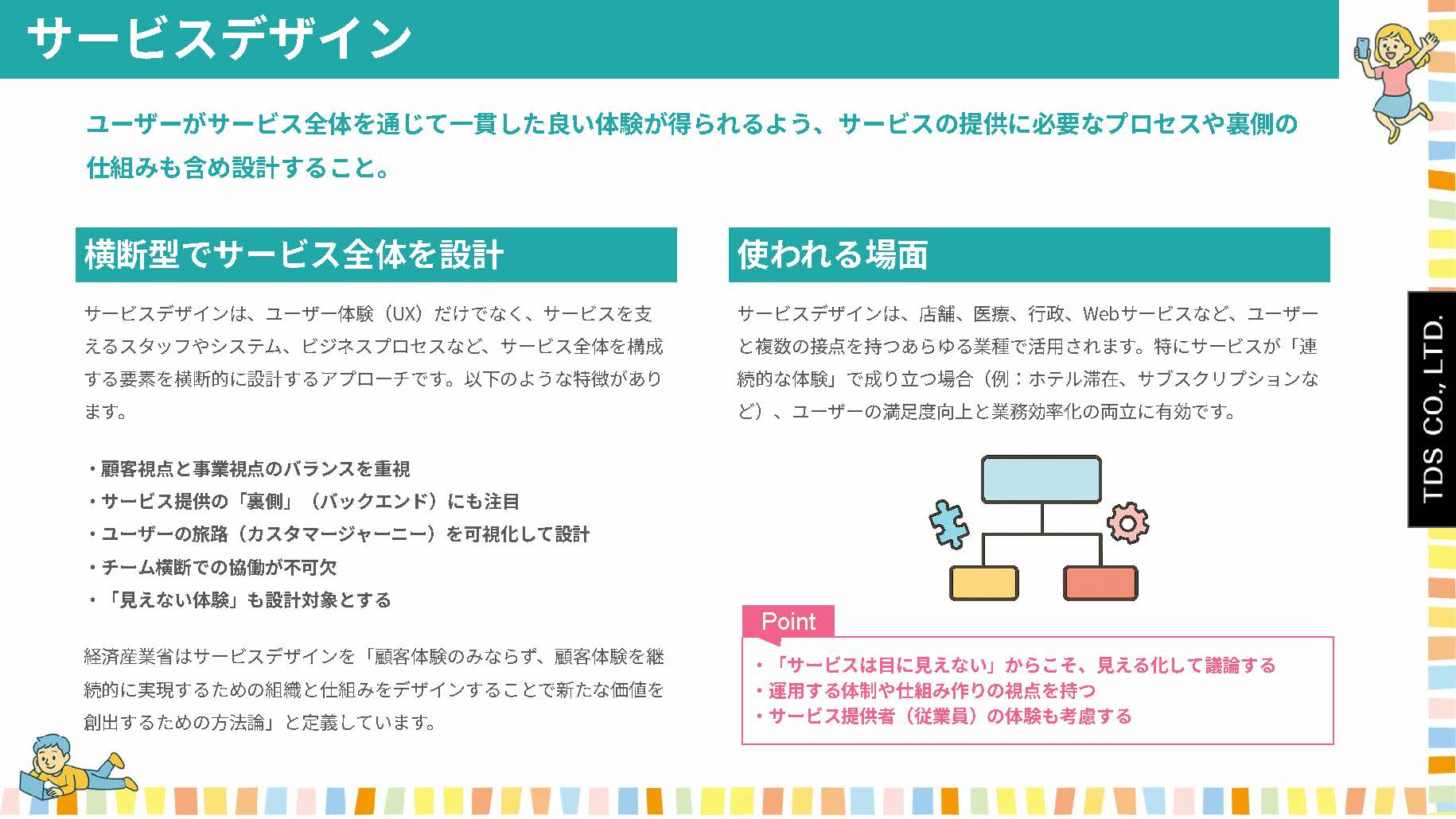 経済産業省はサービスデザインを「顧客体験のみならず、顧客体験を継続的に実現するための組織と仕組みをデザインすることで新たな価値を創出するための方法論」と定義しています。