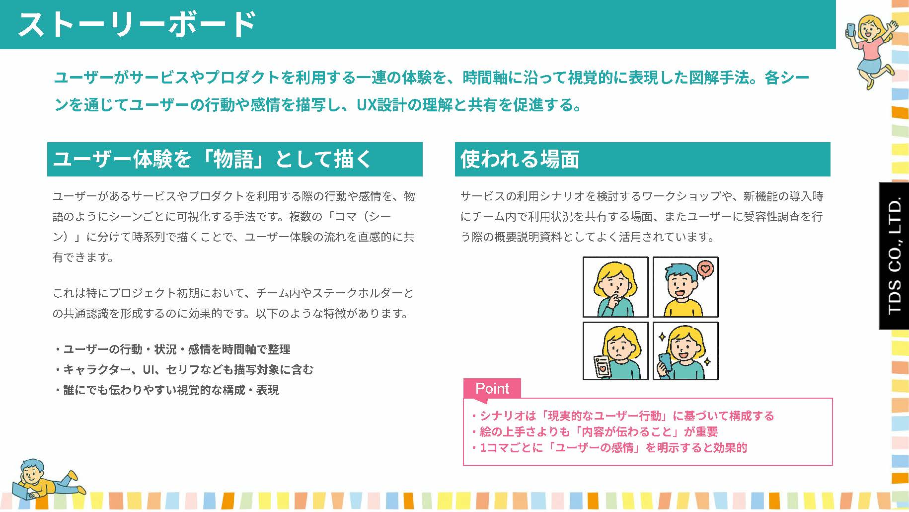 ユーザーがあるサービスやプロダクトを利用する際の行動や感情を、物語のようにシーンごとに可視化する手法です。複数の「コマ(シーン)」に分けて時系列で描くことで、ユーザー体験の流れを直感的に共有できます。