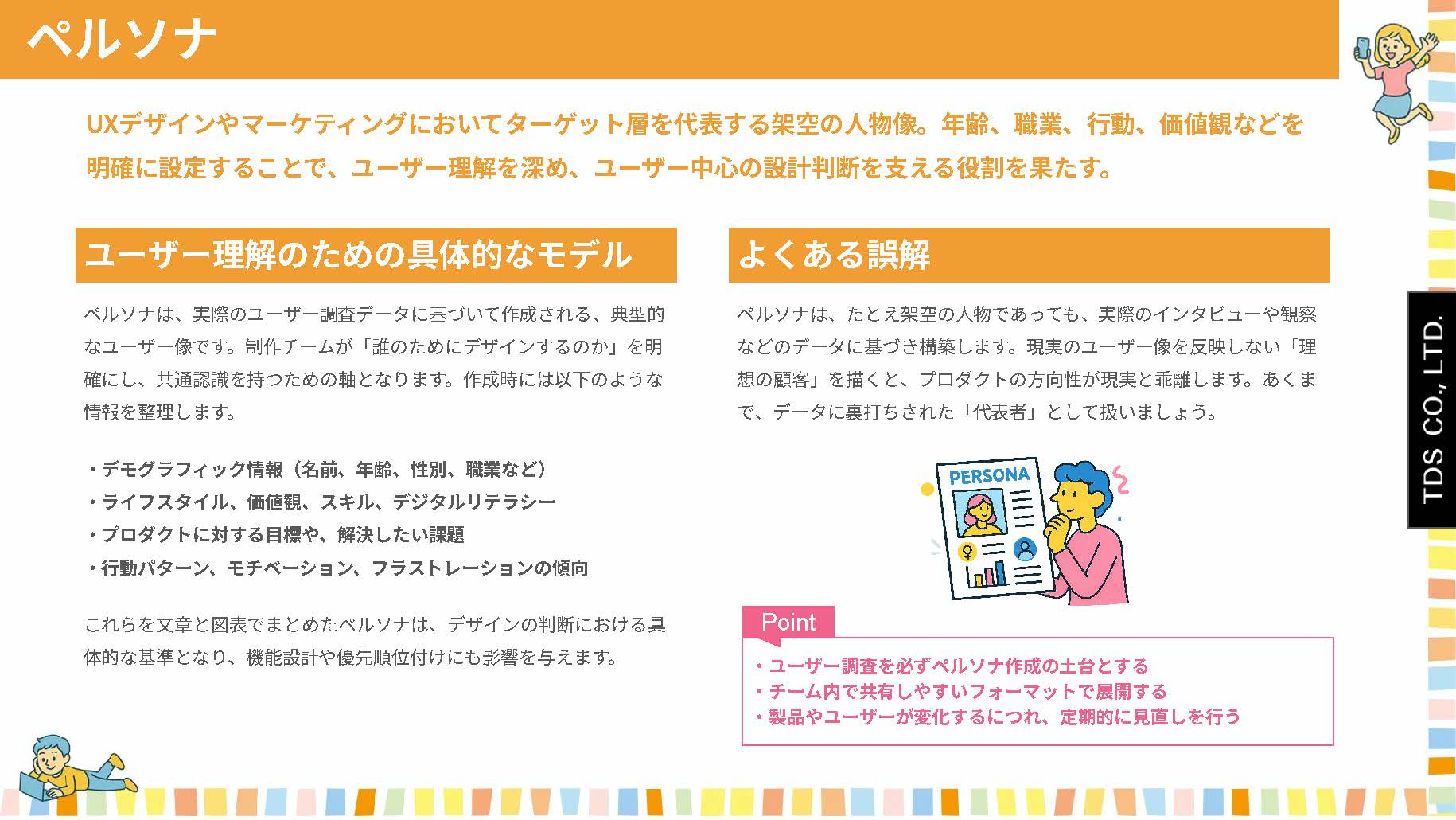 年齢、職業、行動、価値観などを明確に設定することで、ユーザー理解を深め、ユーザー中心の設計判断を支える役割を果たす。