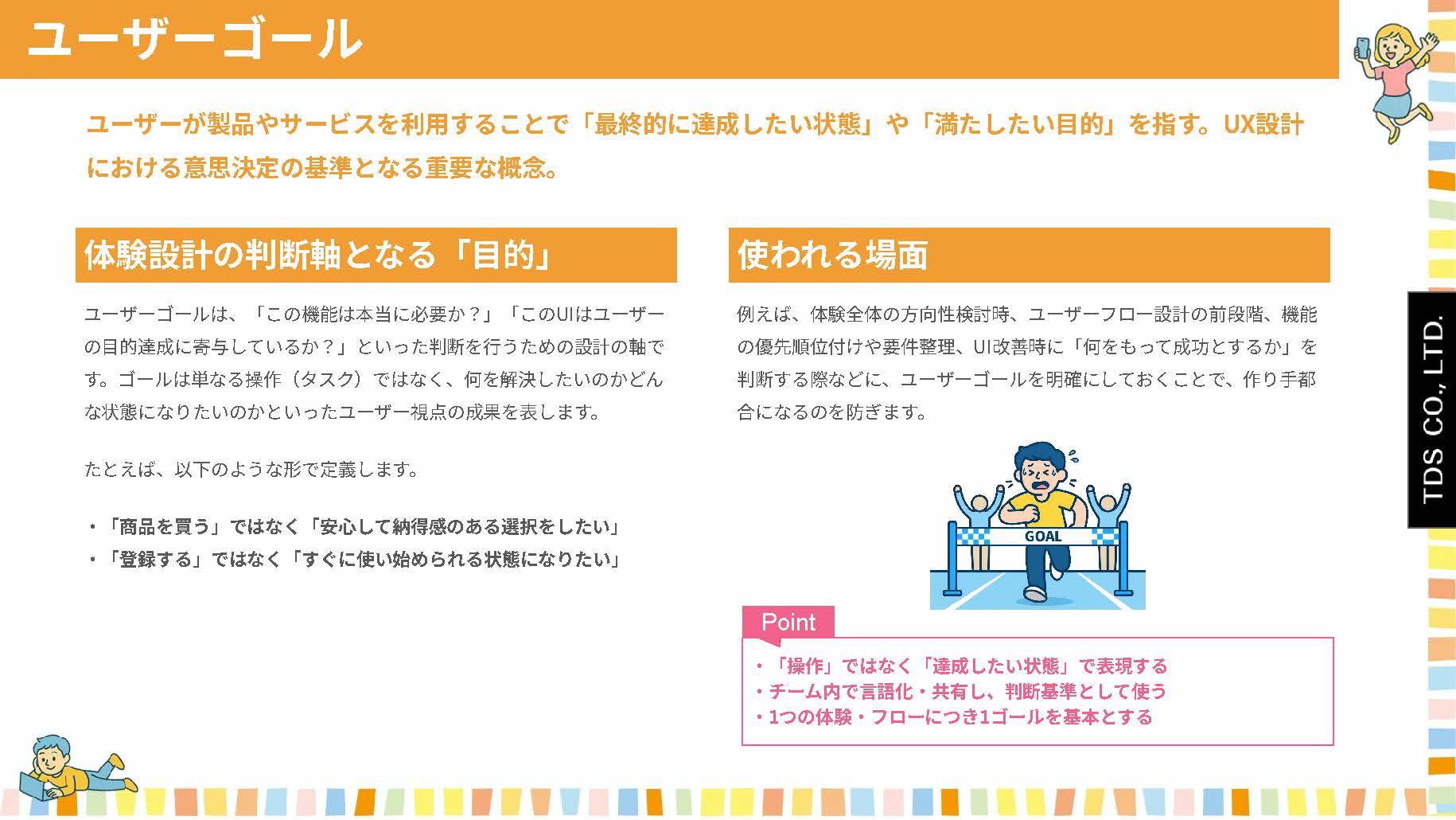 ユーザーゴールは、「この機能は本当に必要か?」「このUIはユーザーの目的達成に寄与しているか?」といった判断を行うための設計の軸です。