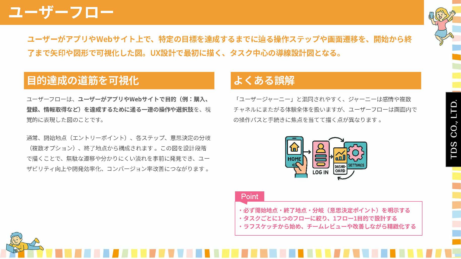 通常、開始地点(エントリーポイント)、各ステップ、意思決定の分岐(複数オプション)、終了地点から構成されます 。この図を設計段階で描くことで、無駄な遷移や分かりにくい流れを事前に発見でき、ユーザビリティ向上や開発効率化、コンバージョン率改善につながります 。