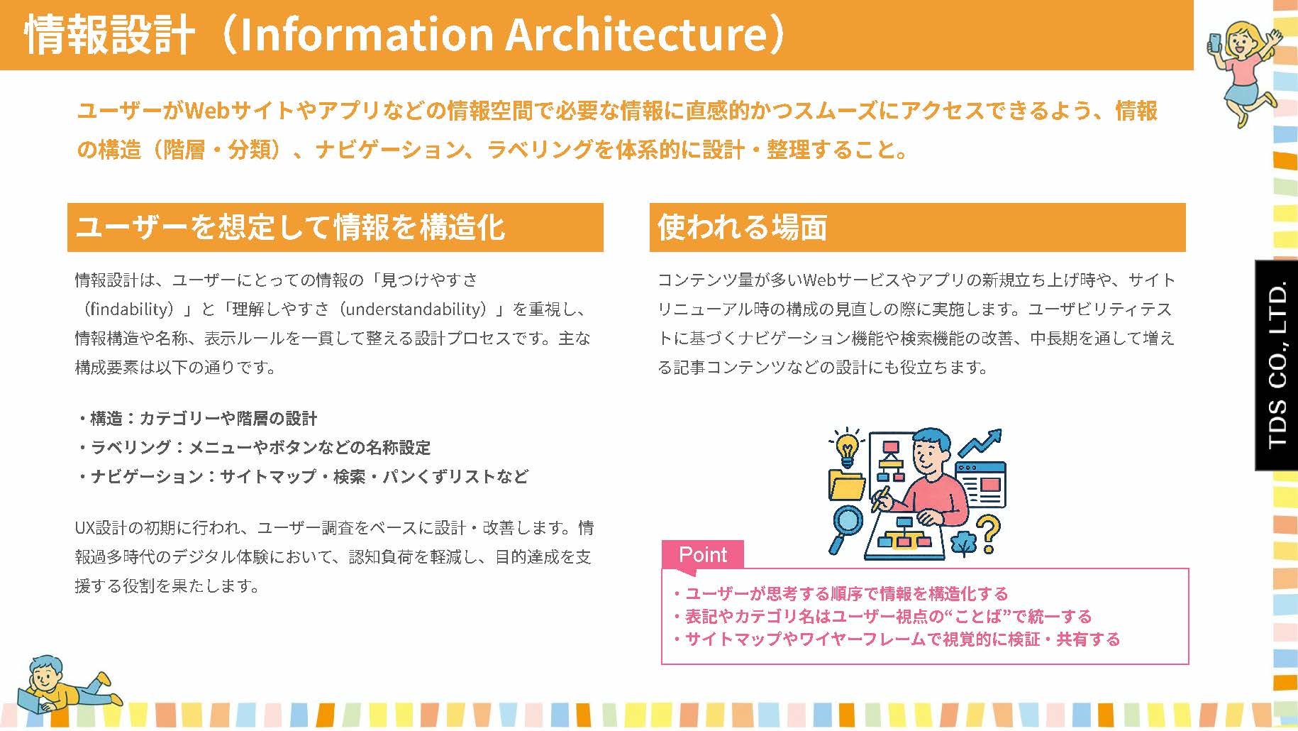 UX設計の初期に行われ、ユーザー調査をベースに設計・改善します。情報過多時代のデジタル体験において、認知負荷を軽減し、目的達成を支援する役割を果たします。