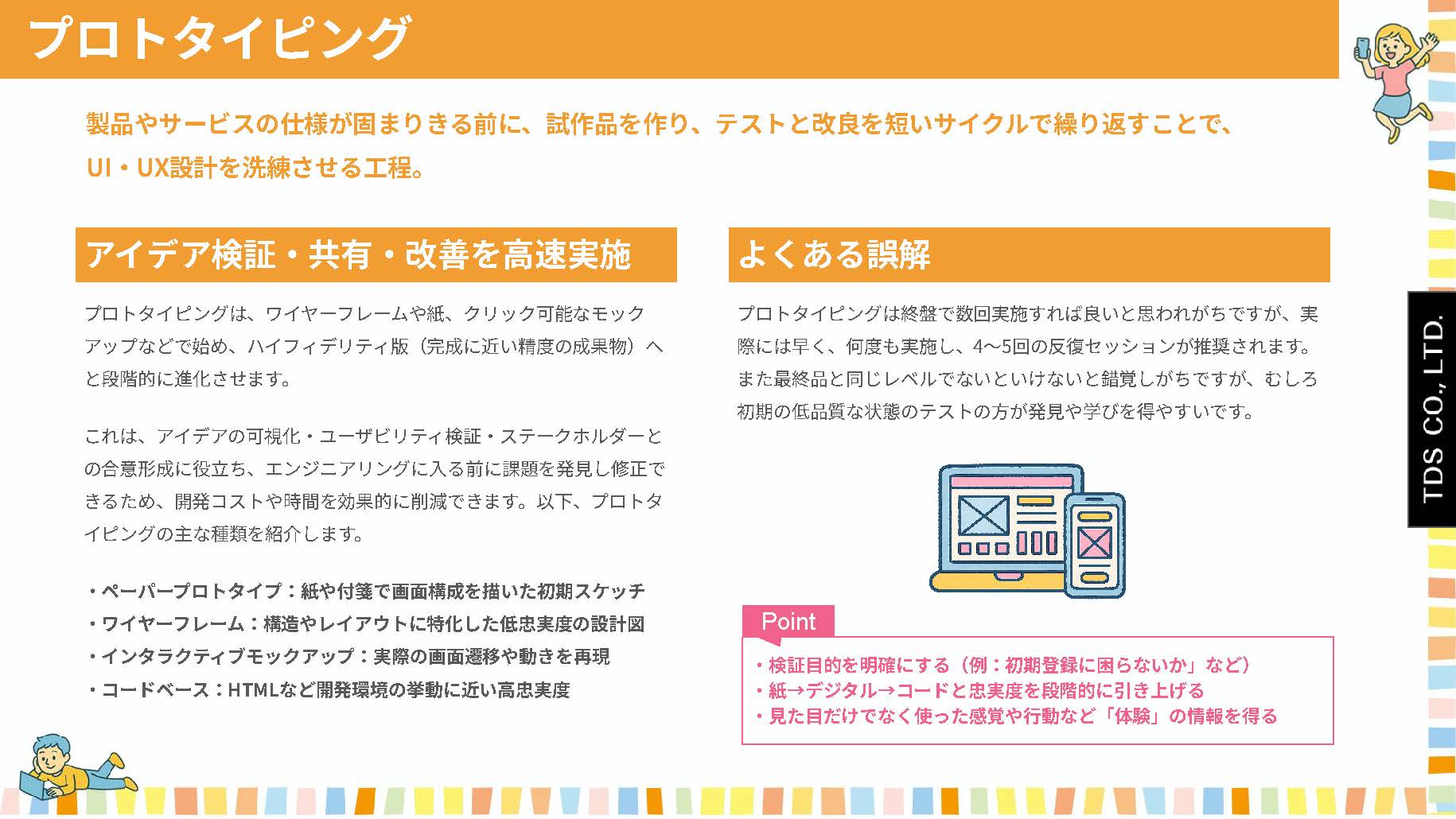 プロトタイピングは終盤で数回実施すれば良いと思われがちですが、実際には早く、何度も実施し、4〜5回の反復セッションが推奨されます。また最終品と同じレベルでないといけないと錯覚しがちですが、むしろ初期の低品質な状態のテストの方が発見や学びを得やすいです。