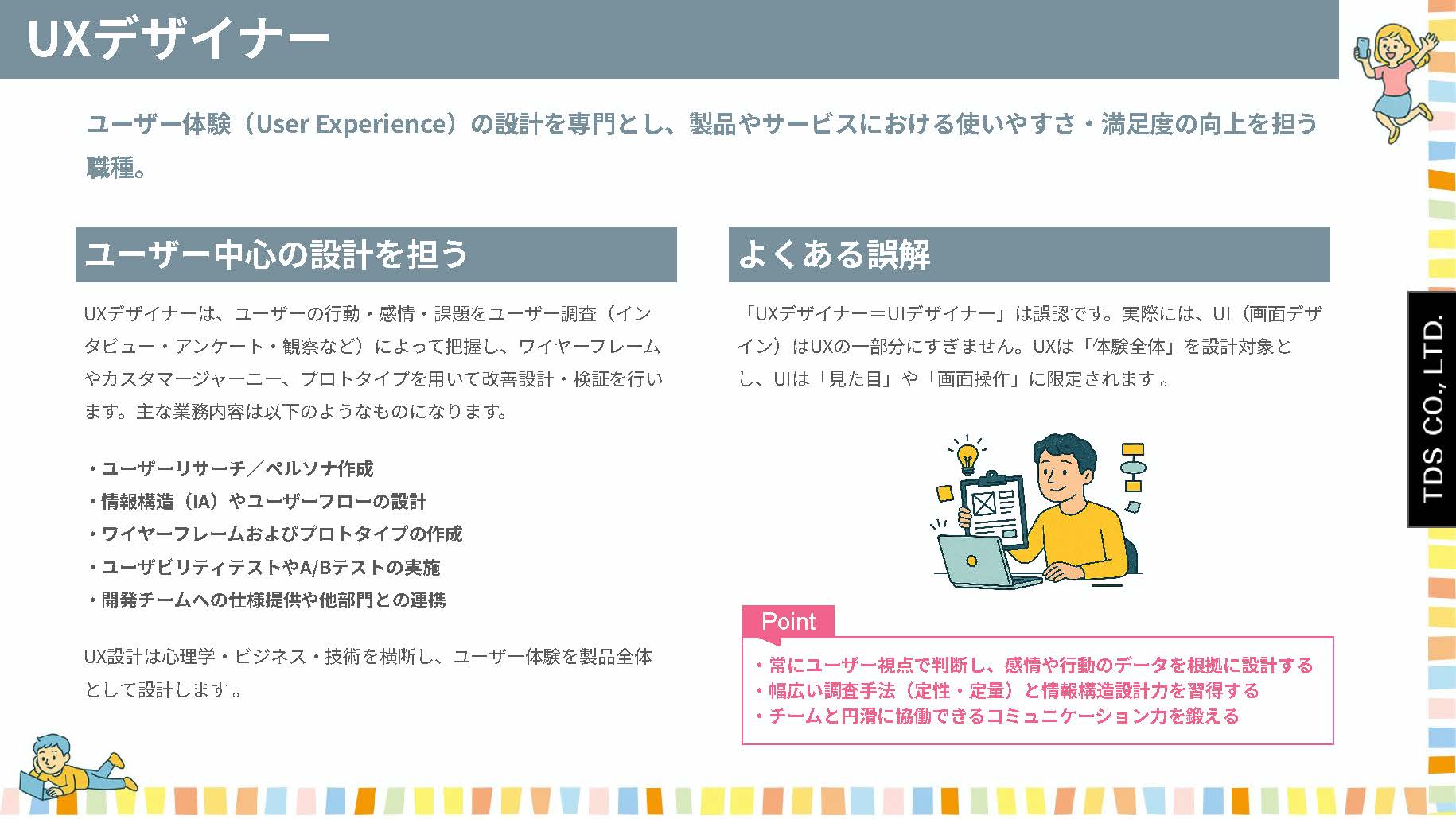 加えて、UX特有のスキルとして「デザイン思考の理解」「情報設計やビジュアル原則の基礎知識」「ユーザーテストや分析プロセスへの理解」など幅広い知見が求められます。