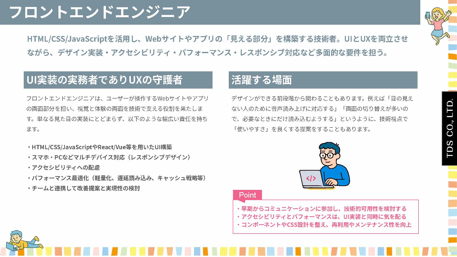 HTML/CSS/JavaScriptを活用し、Webサイトやアプリの「見える部分」を構築する技術者。UIとUXを両立させながら、デザイン実装・アクセシビリティ・パフォーマンス・レスポンシブ対応など多面的な要件を担う。