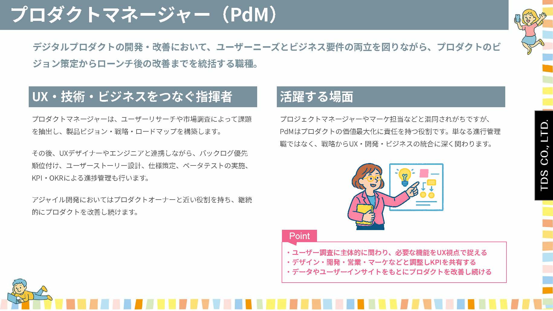 デジタルプロダクトの開発・改善において、ユーザーニーズとビジネス要件の両立を図りながら、プロダクトのビジョン策定からローンチ後の改善までを統括する職種。