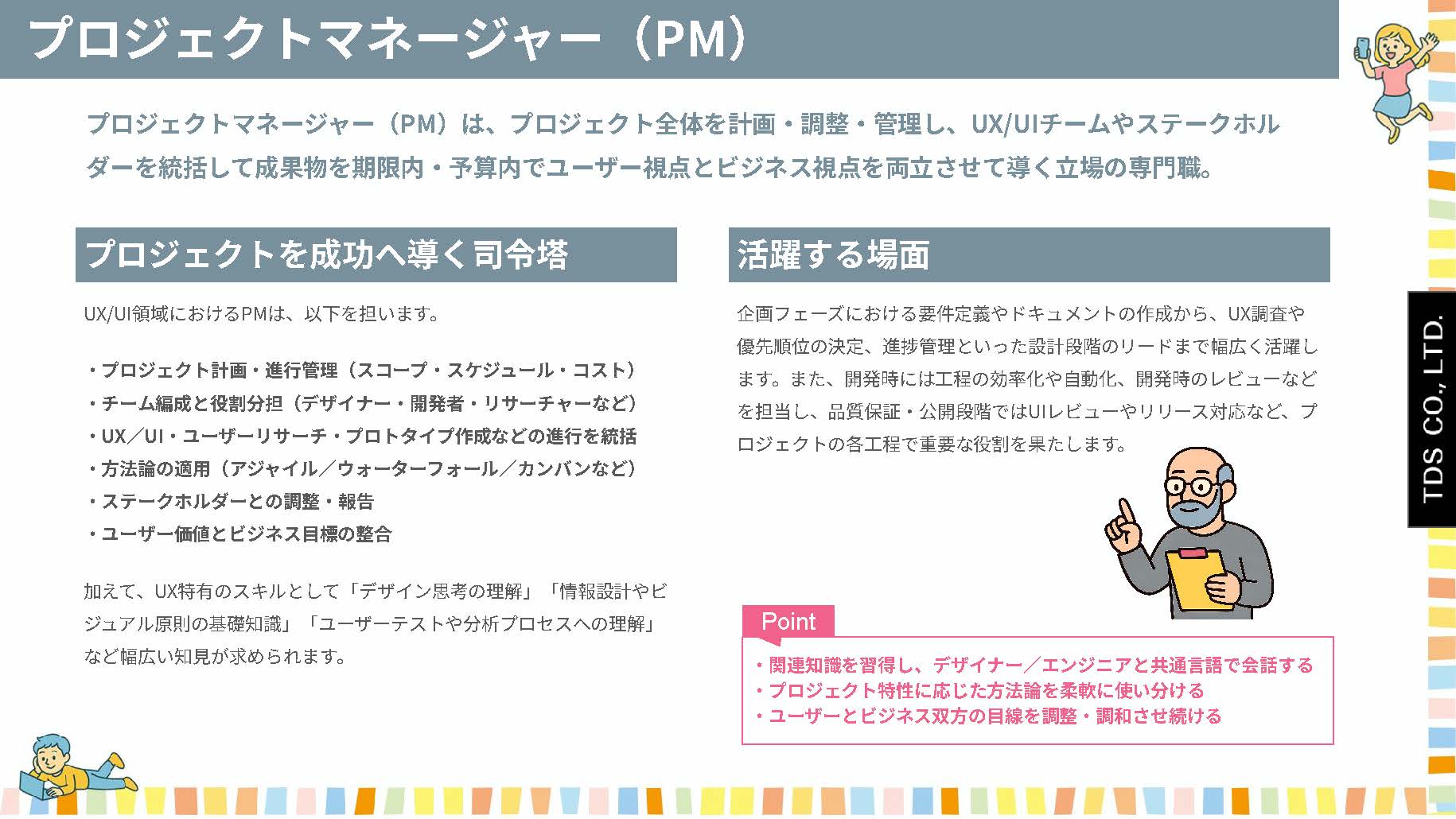 プロジェクトマネージャー(PM)は、プロジェクト全体を計画・調整・管理し、UX/UIチームやステークホルダーを統括して成果物を期限内・予算内でユーザー視点とビジネス視点を両立させて導く立場の専門職。
