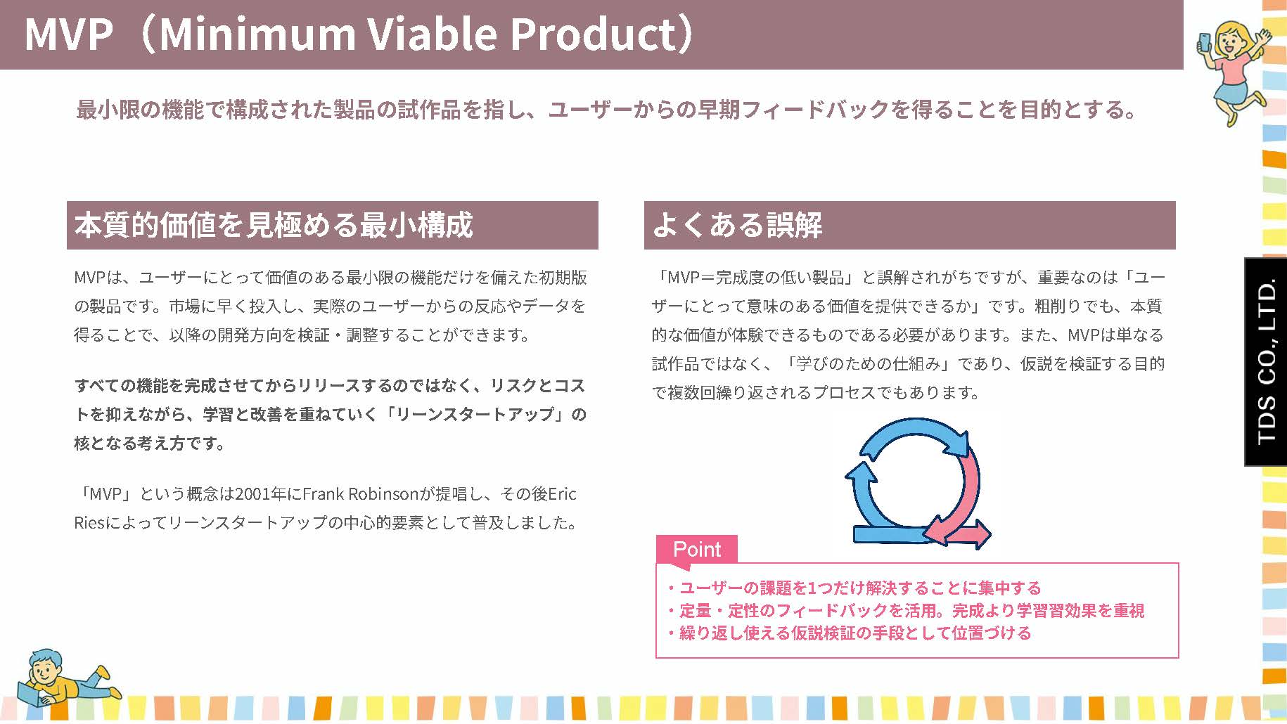 すべての機能を完成させてからリリースするのではなく、リスクとコストを抑えながら、学習と改善を重ねていく「リーンスタートアップ」の核となる考え方です。