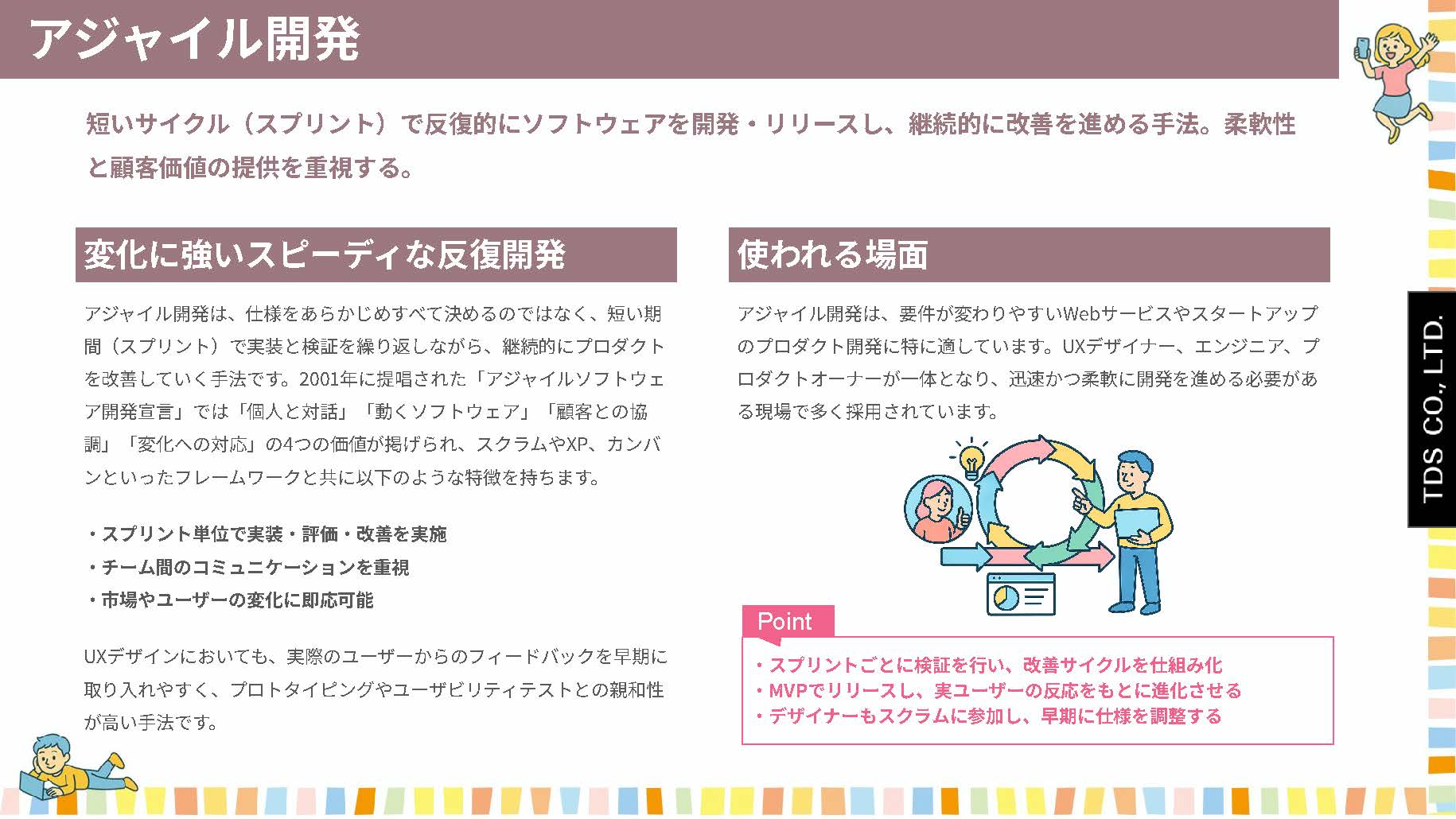 UXデザインにおいても、実際のユーザーからのフィードバックを早期に取り入れやすく、プロトタイピングやユーザビリティテストとの親和性が高い手法です。