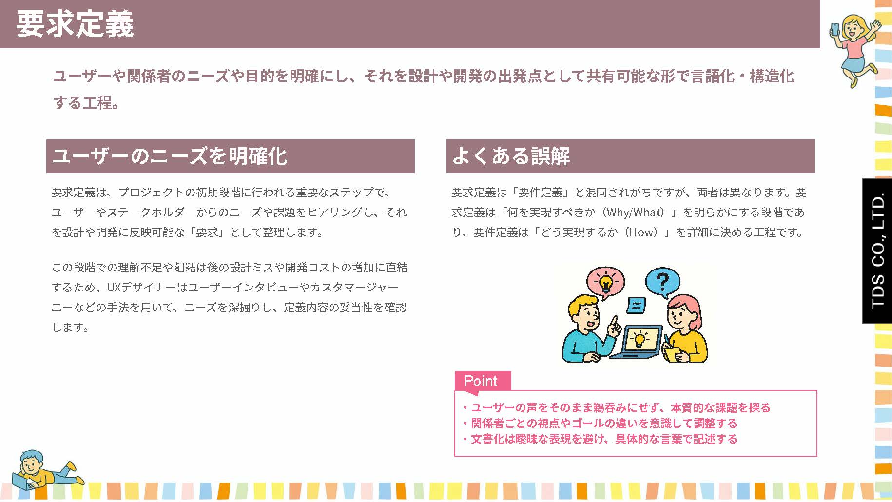要求定義は、プロジェクトの初期段階に行われる重要なステップで、ユーザーやステークホルダーからのニーズや課題をヒアリングし、それを設計や開発に反映可能な「要求」として整理します。