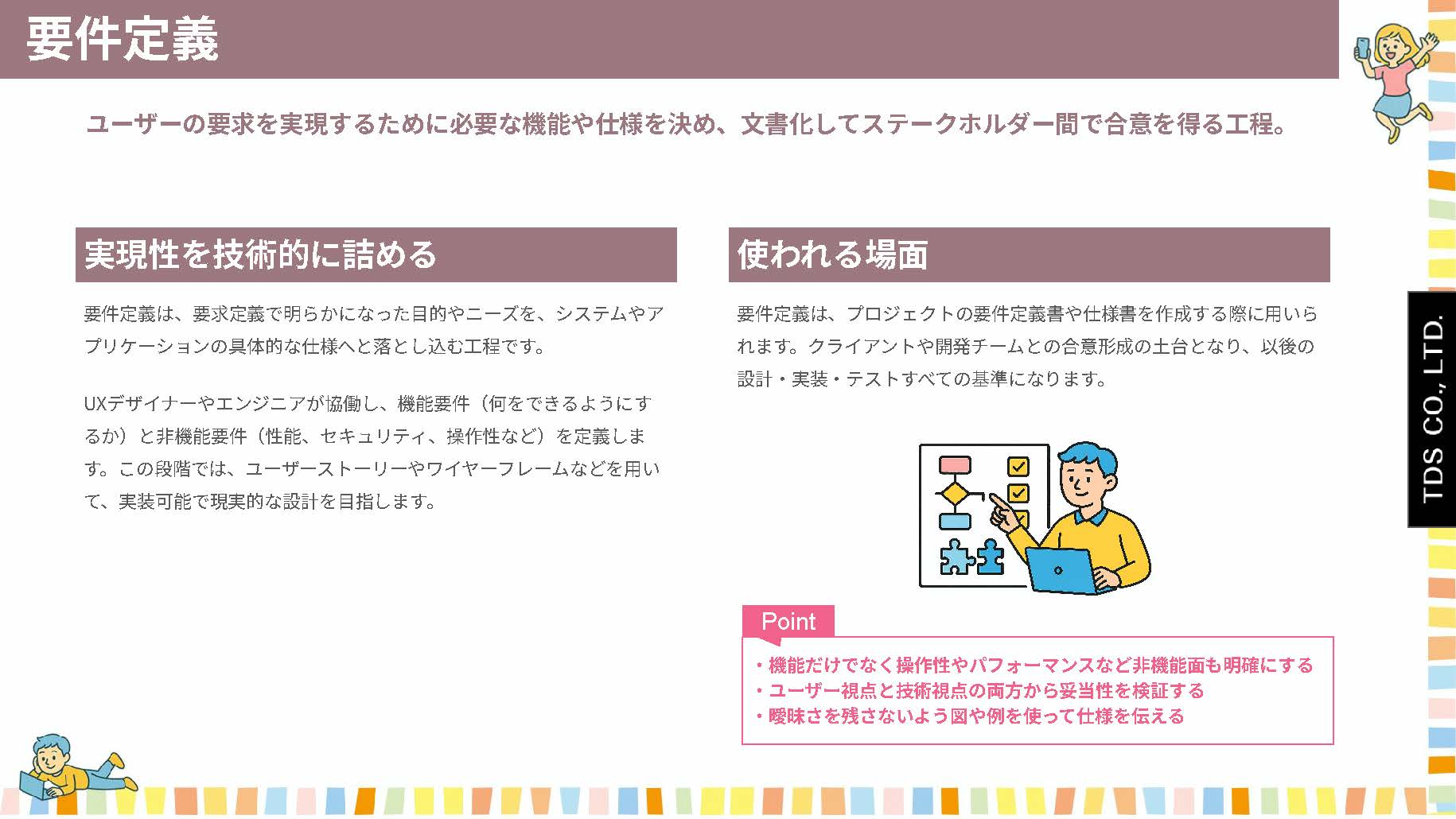 この段階での理解不足や齟齬は後の設計ミスや開発コストの増加に直結するため、UXデザイナーはユーザーインタビューやカスタマージャーニーなどの手法を用いて、ニーズを深掘りし、定義内容の妥当性を確認します。