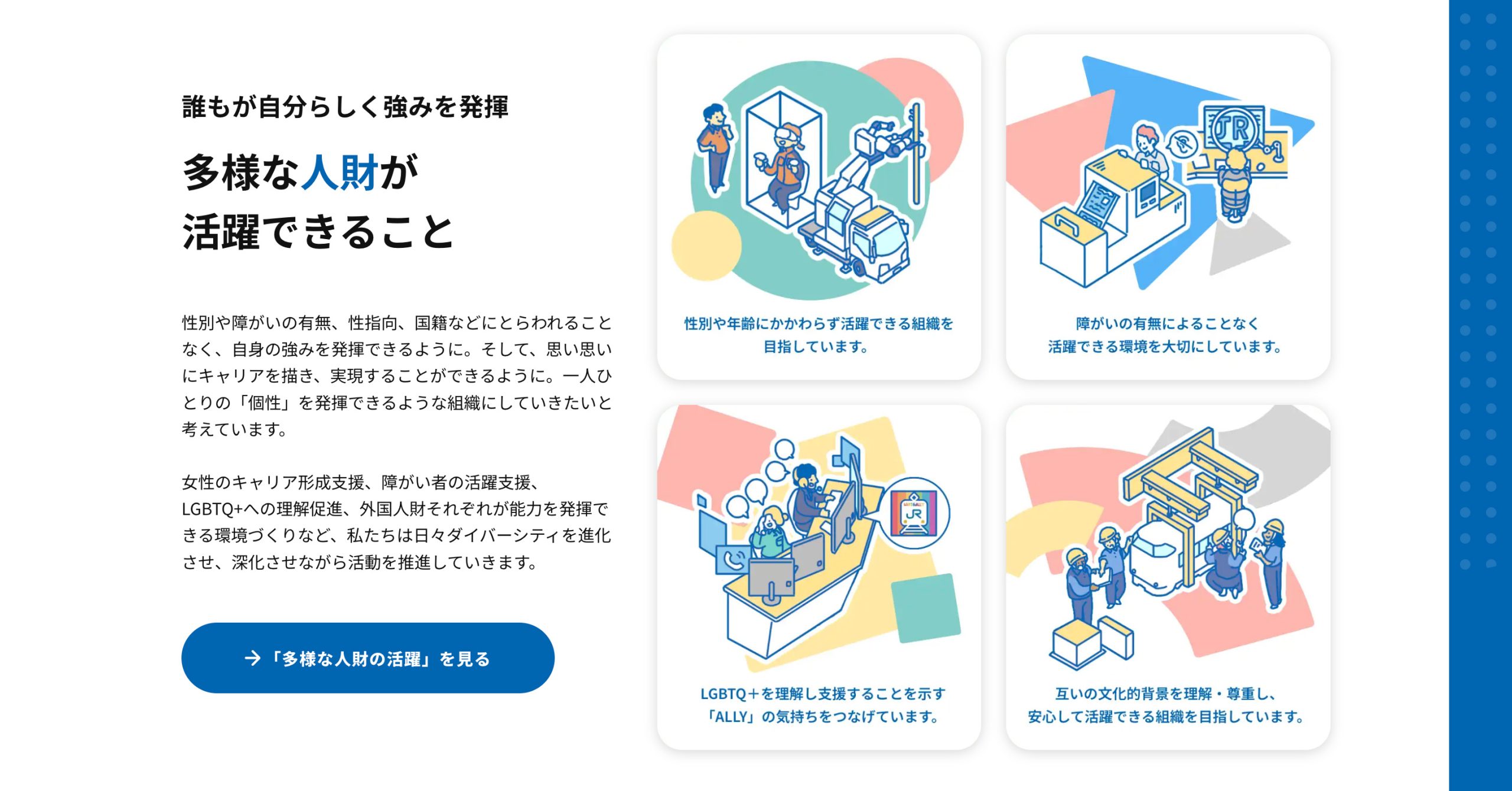 JR西日本では、ダイバーシティ&インクルージョン(D&I)の理念・取り組み・制度を社内外に広く伝える広報活動において、既存サイトでは、同社が大切にしている「一人ひとりの個性が活かされ、新しい価値が生まれていく」という理念を十分に伝えきれていないという課題をお持ちでした。