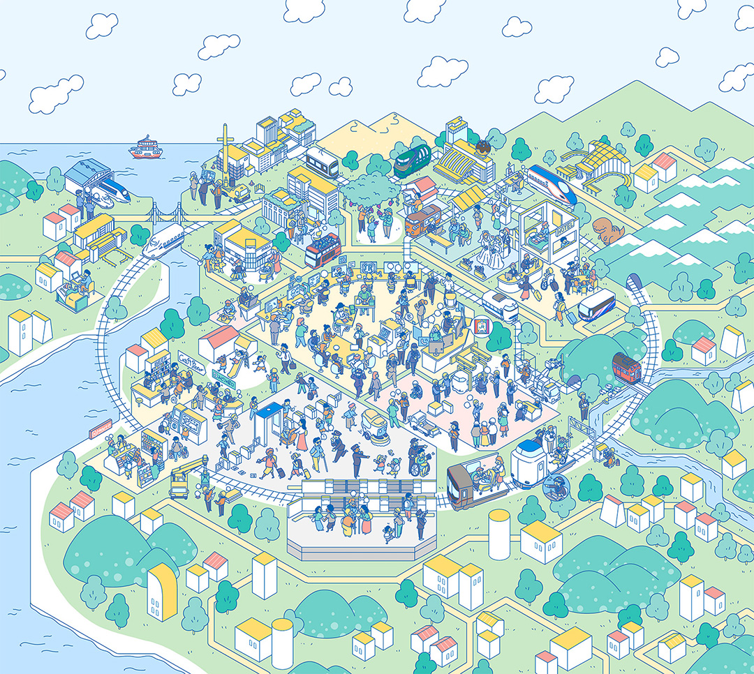 鉄道事業ならではの情景や地域のランドマーク、多様な人物像を盛り込み、理念と施策が自然に理解できるビジュアルに仕上げています。