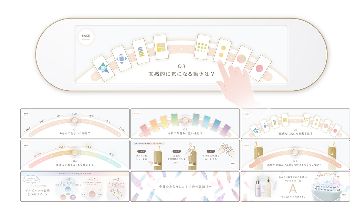 オープン後は1日あたり約200人が診断を体験。サンプルを手に取るきっかけとして、多くの方が気軽に立ち寄れるコンテンツとなりました。画面上では乳液の質感や色のニュアンスを感じられ、診断のプロセス自体がブランドを知る体験になるよう、“見る・触れる・選ぶ”という一連の動作を通して、アルビオン様らしい上質さと遊び心が伝わる構成に仕上げることができました。
